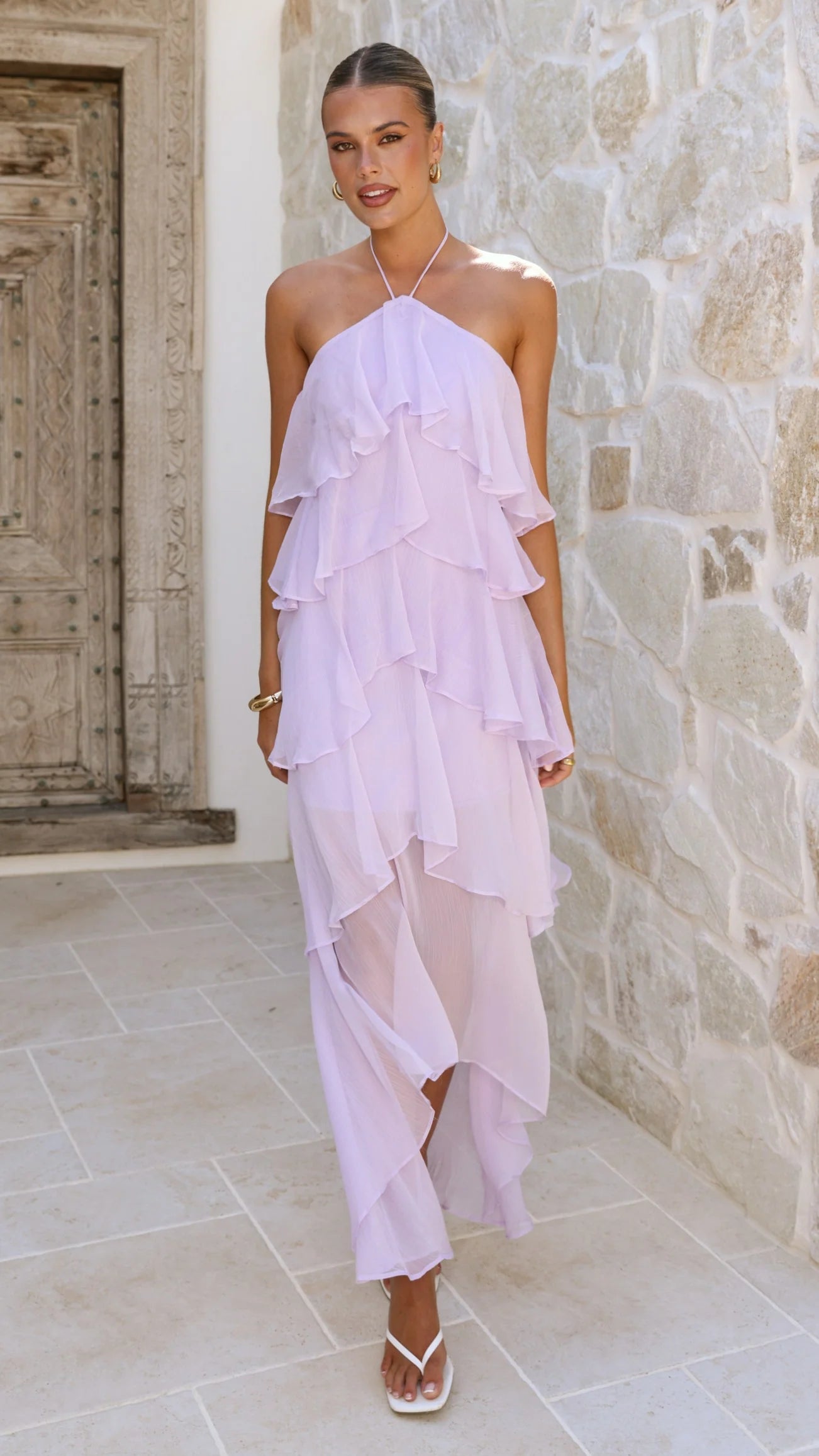 Elevate your style with the Soho Maxi Dress in Lilac. This daring design features a halter neckline framed by delicate frill details. Lined for a flawless fit, it secures with a concealed centre back zipper and hook and eye closure, ensuring both comfort and confidence from day to night.