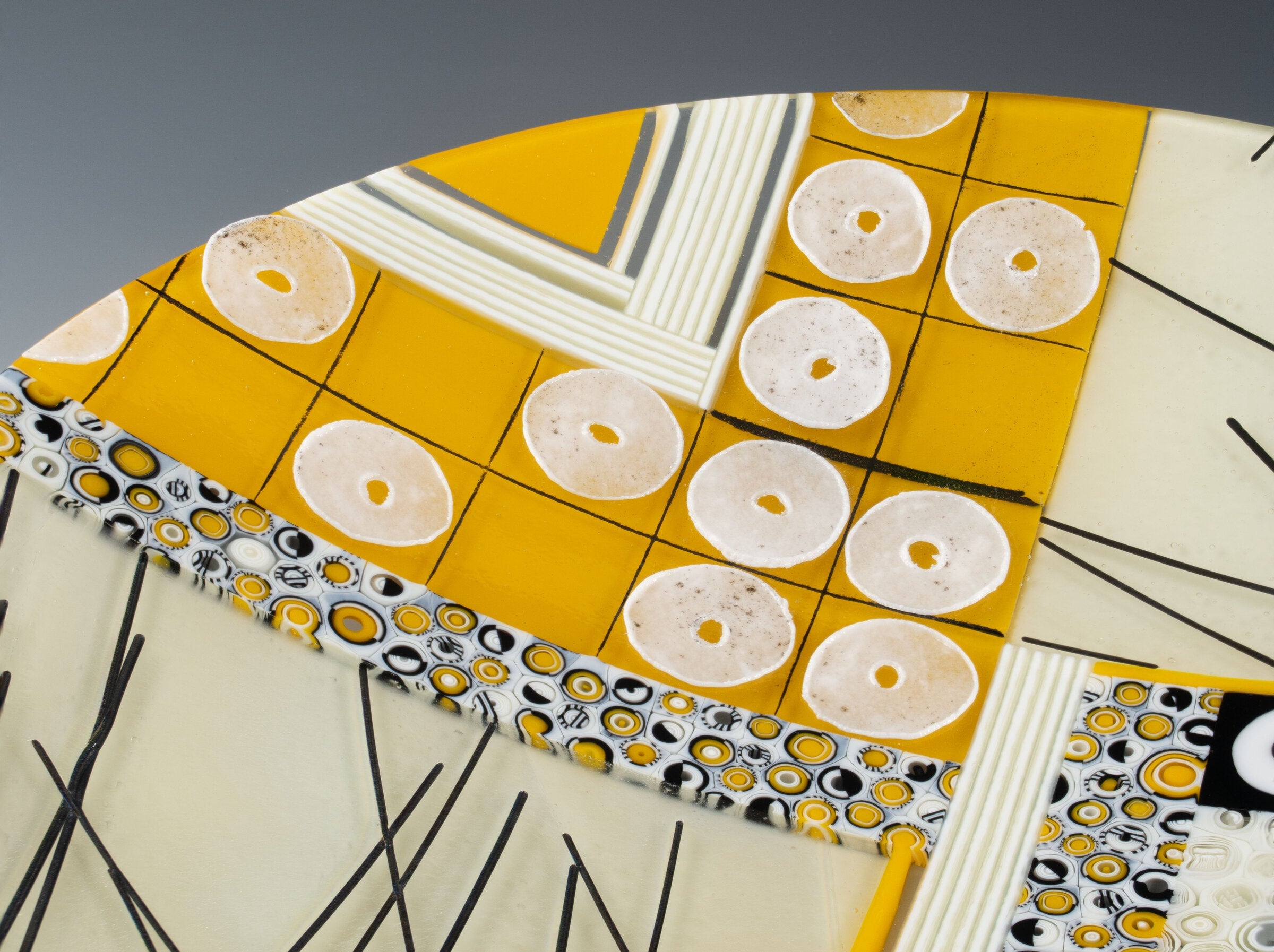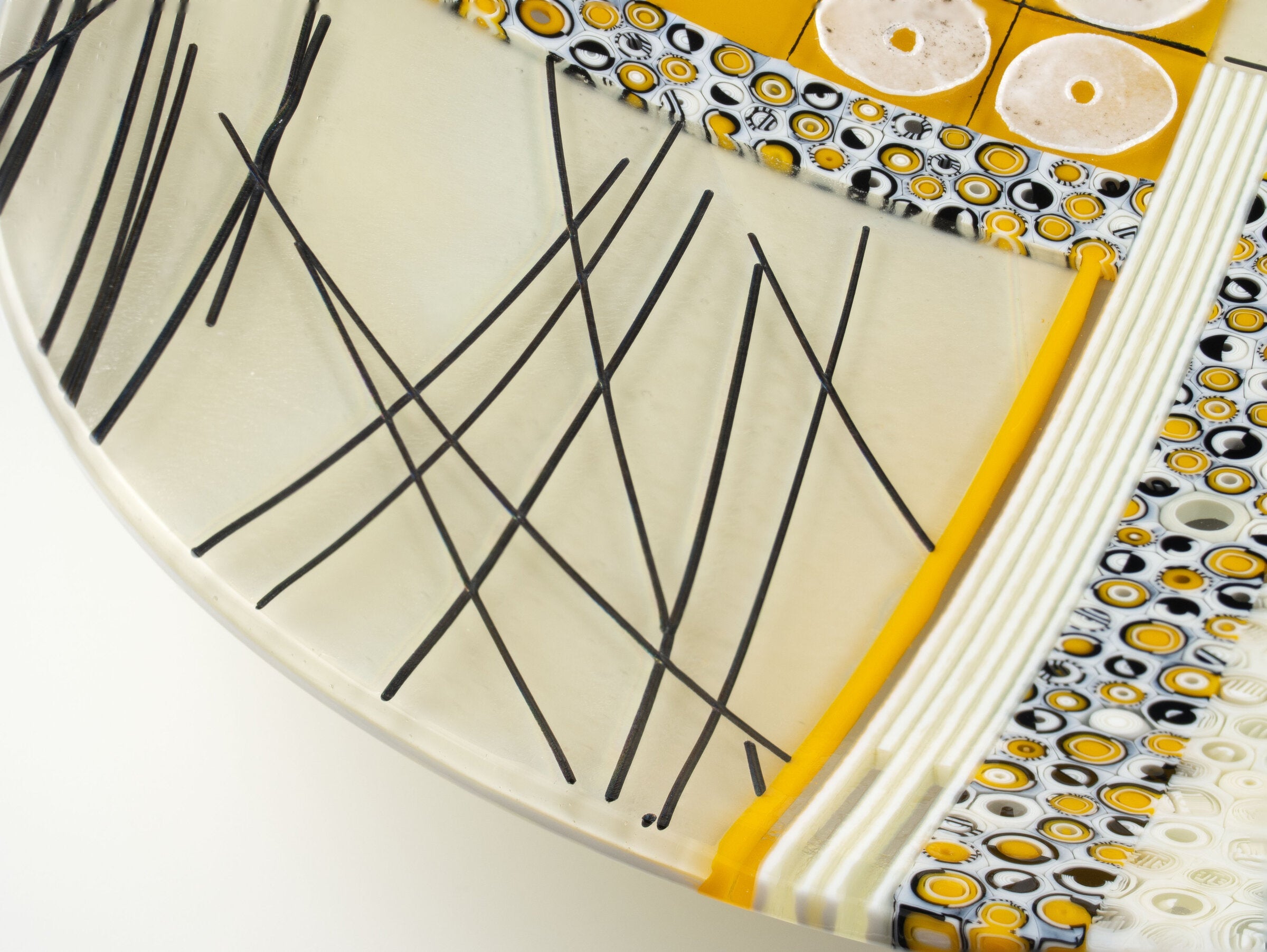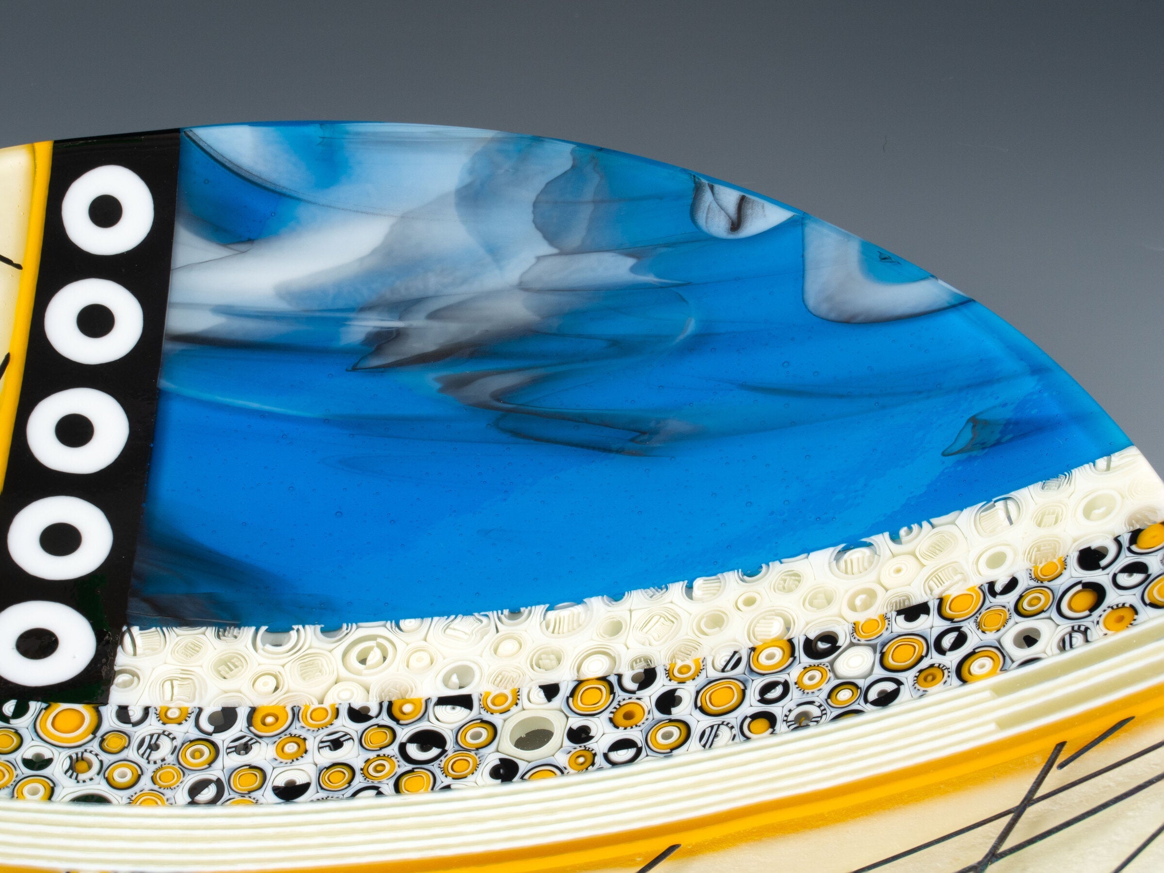 Rich hues of blue and electric marigold, sparkling iridescence, patterned murrini, floating threads of glass, and raised rings of powder create a richly tactile surface in this fused and cold worked glass bowl, slumped into artful form. Signed on the bottom.