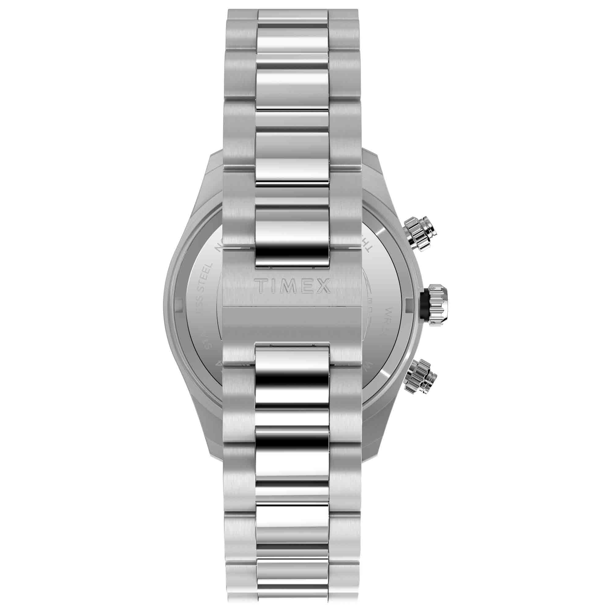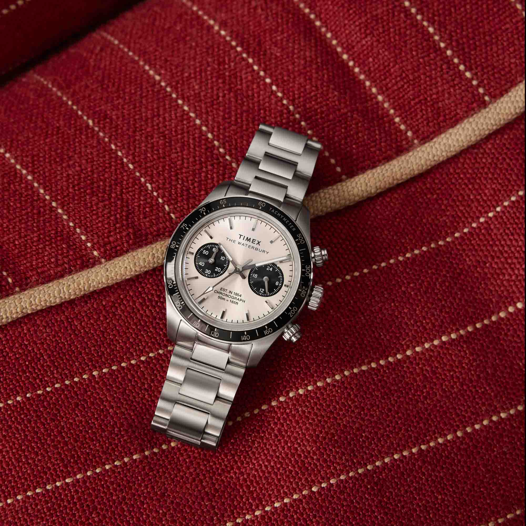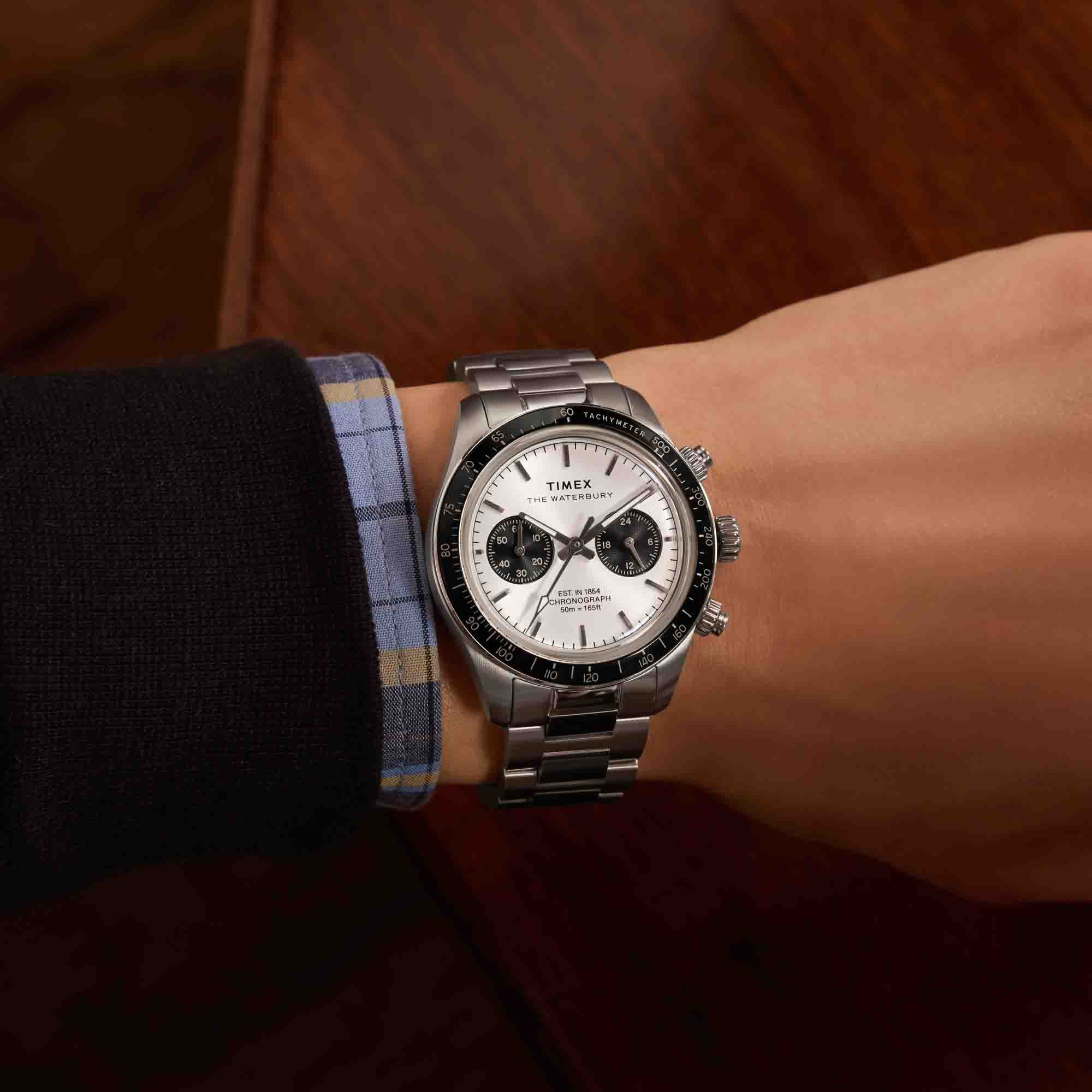 The Waterbury Heritage Chronograph combines modern functionality with timeless design, featuring a chronograph to track elapsed time and a black tachymeter bezel for determining average speed. Complementing its 39mm brushed stainless-steel case is a coordinating brushed and polished stainless-steel bracelet with self-adjustable links for easy sizing without the need for tools. The silver-tone dial is accented by contrasting sub-dials and safeguarded by an anti-reflective mineral glass crystal for enhanced clarity. Luminant hands ensure visibility in lowlight conditions, while applied indices and intricate detailing on the crown and pushers add a refined touch.
