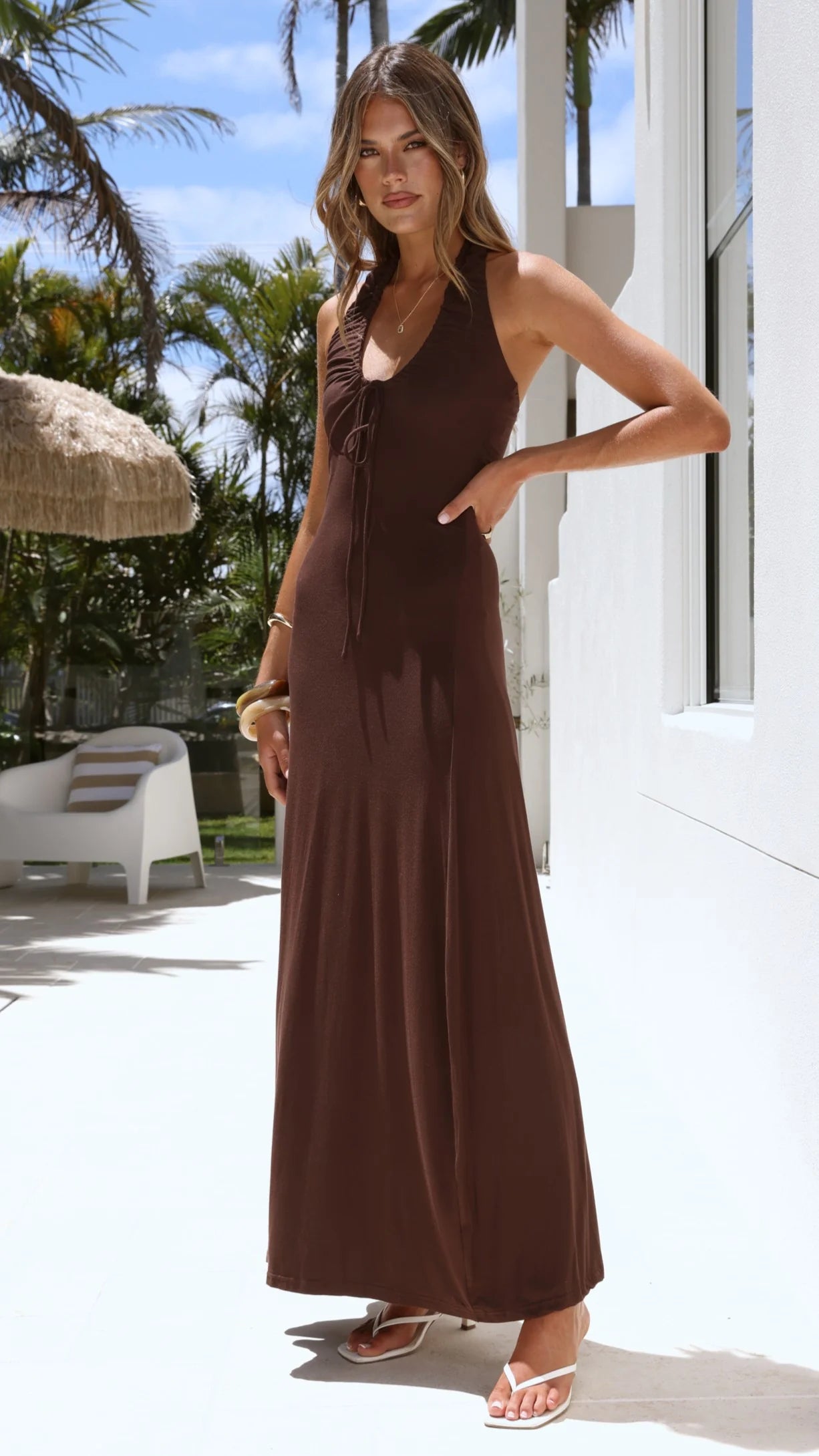 Slip into effortless elegance with the Toryah Maxi Dress in Brown. This showstopper features a halter neck design with an adjustable tie at the bustline for a customised fit. Offering secure support with its elasticated back panel for all-day comfort, and the full maxi length creates a flowing silhouette. Lined for comfort.