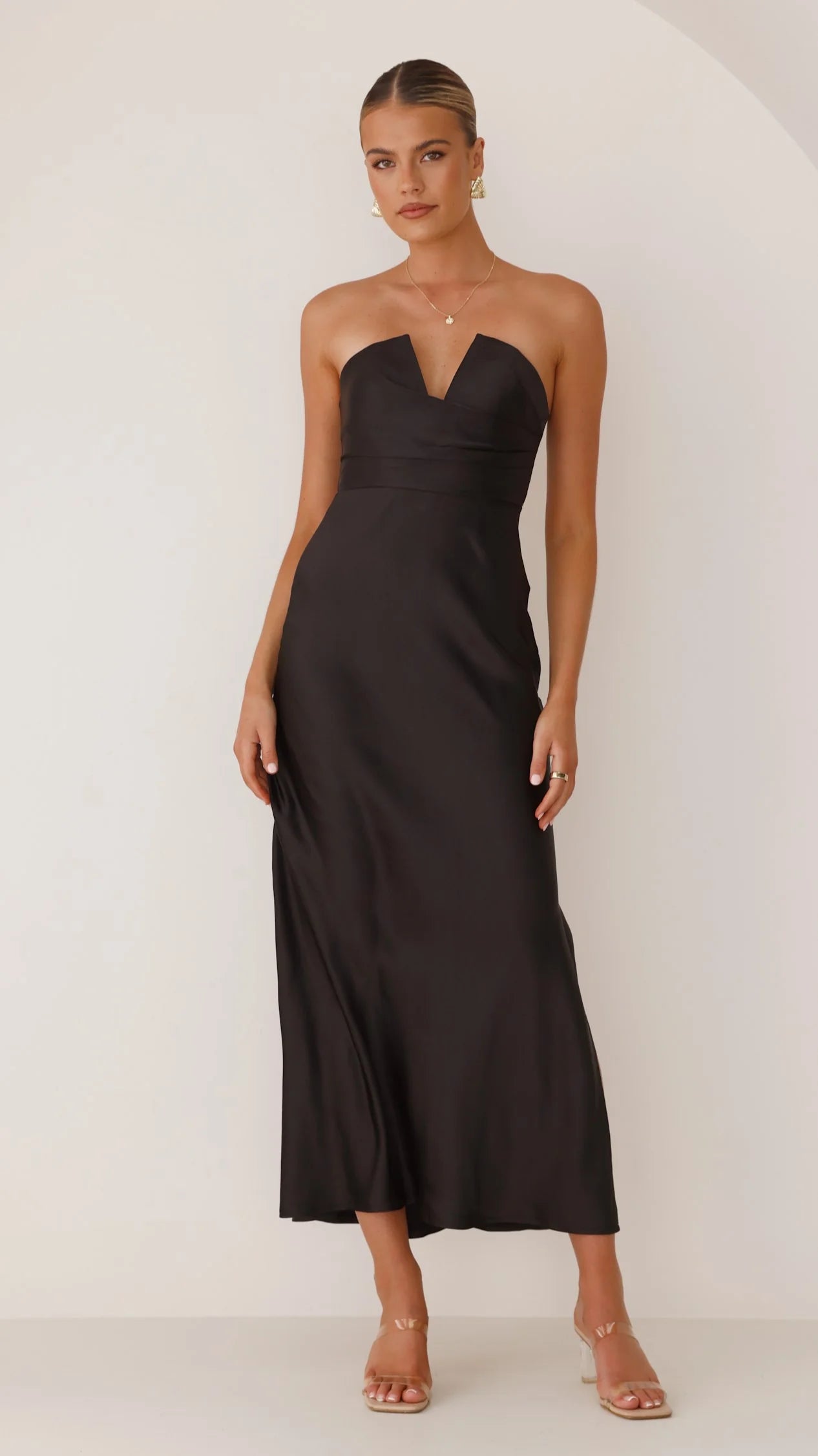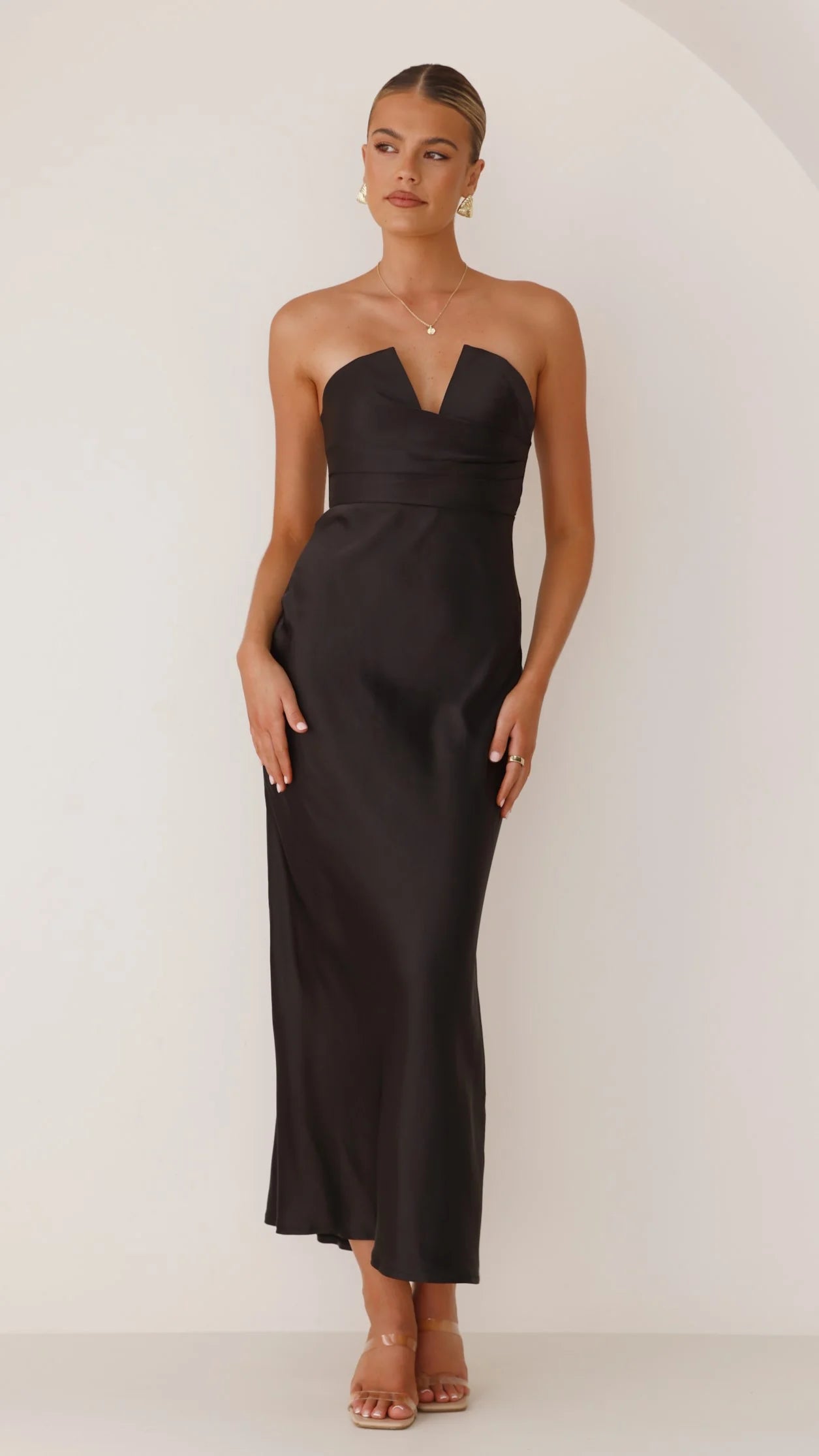 This Valerie Maxi Dress in Black features a stunning V bust design and gathered detailing on the side for an elegant touch. The full length style and padded bust provide both comfort and style, while the strapless design and invisible back zipper add a touch of sophistication. Perfect for any special occasion.