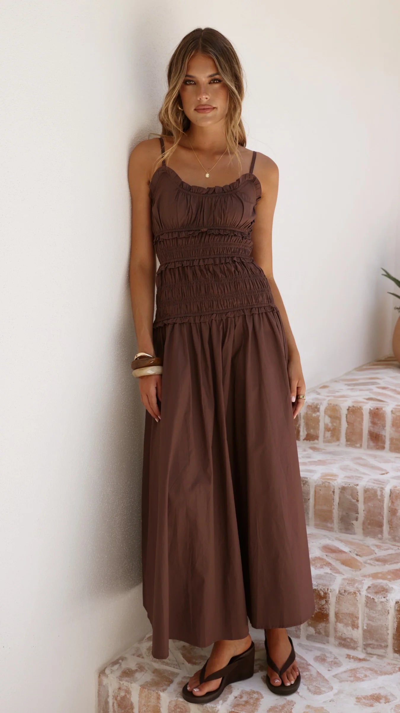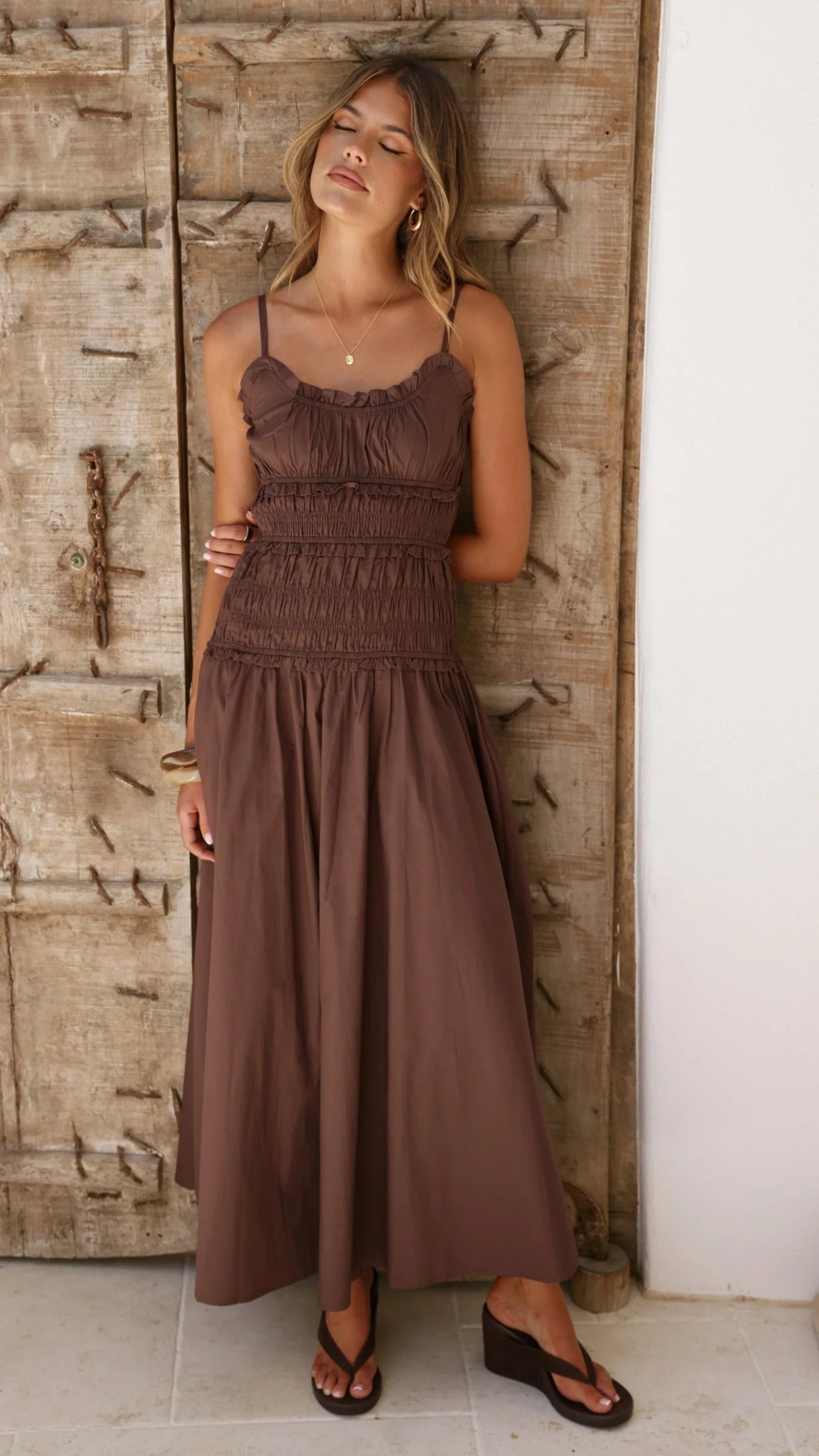 The Vida Maxi Dress in White features adjustable spaghetti straps and a ruffle-detail scoop neckline, adding a delicate touch to its sophisticated design. Its tiered elasticated gathering and fitting shirring through the body create a flattering silhouette while ensuring comfortable wear.