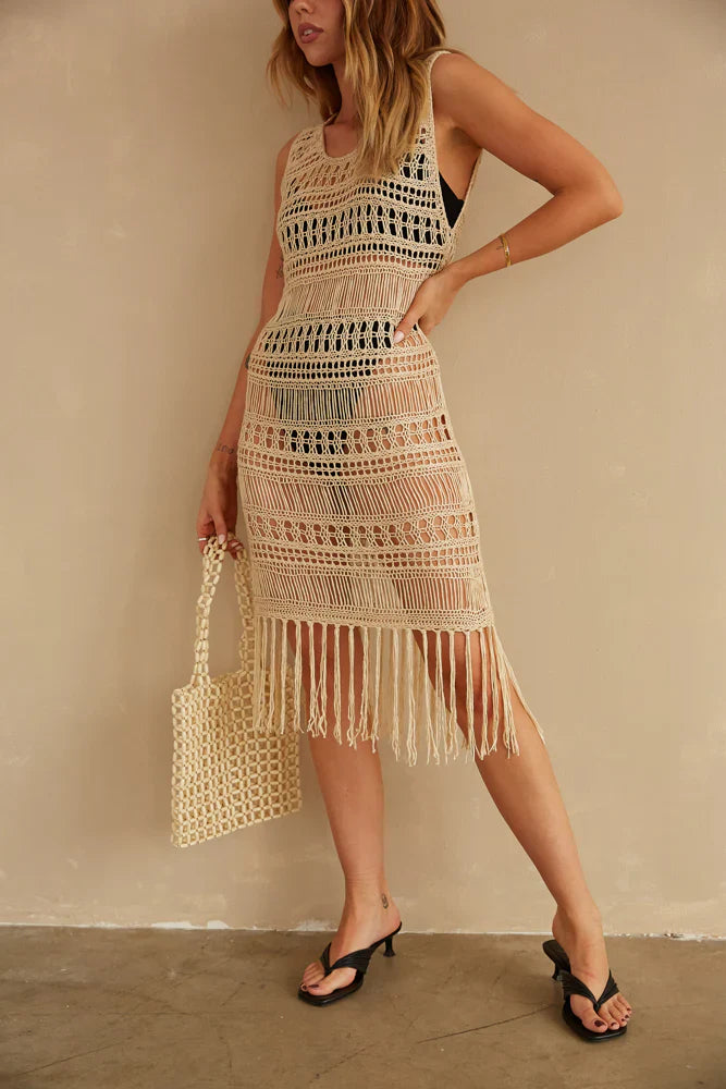 Soak up the sun in the Waikiki Crochet Midi Dress! Featuring an open knit design with a boxy silhouette and a flowy tassel hemline to complete this perfect swim cover. Available in beige. Pair with the for the perfect vacay look!