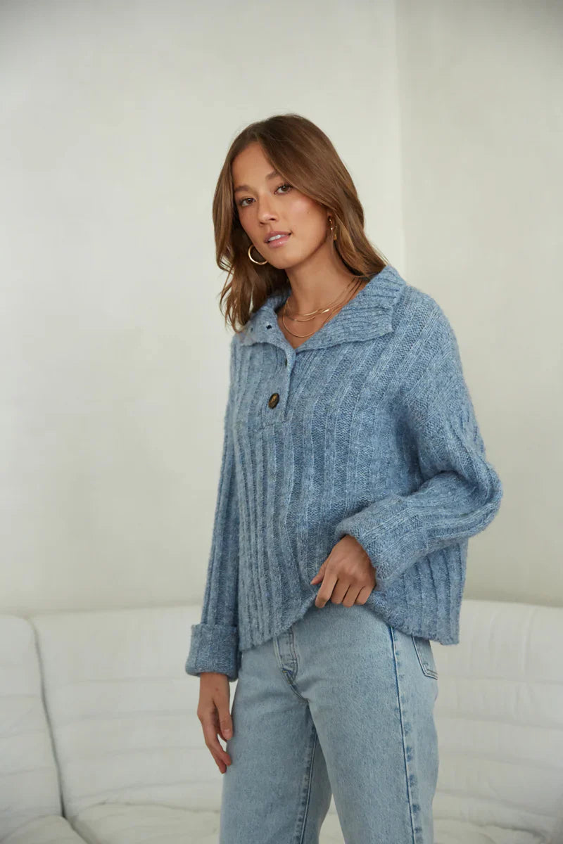 Your closet isn't complete without the Waverly Collared Sweater! This cozy sweater features a fuzzy rib knit, oversize boxy fit, and quarter button up design. Available in heather blue. Pair with some to complete the look!
