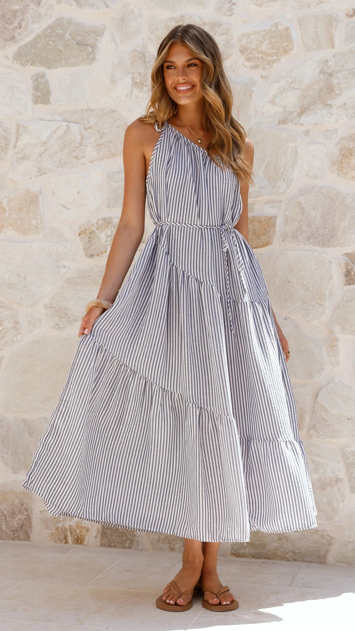 Elevate your wardrobe with the Wendy One Shoulder Maxi Dress in Blue and White Stripe. Featuring a graceful one-shoulder tie design and elegant tiered detailing, this maxi dress combines sophistication with comfort. The detachable waist tie allows for a customizable fit, while side pockets add practical charm. Perfect for making a refined statement at any event, this dress effortlessly balances style and functionality.