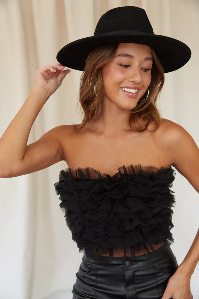 Hey babe! Turn heads in the Zoe Tulle Frills Tube Top. This strapless top features all over tulle ruffles and an elastic top band for a secure fit! Pair this stunning top with the for an edgy feminine look!